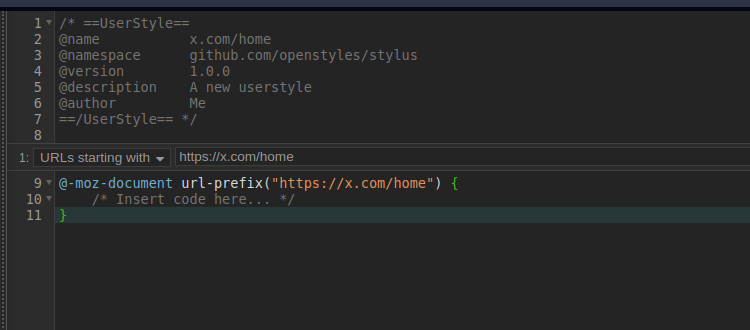 Şimdiii burada yapmanız gereken ilk şey “URLs starting with” kısmında yazan “https://x.com/home” ifadesinden “home” kısmını silmek, yani şöyle olması gerekiyor: “https://x.com/”. Çünkü diğer türlü yazacağımız kod tüm Twitter sayfalarını değil, sadece ana sayfayı etkiler.